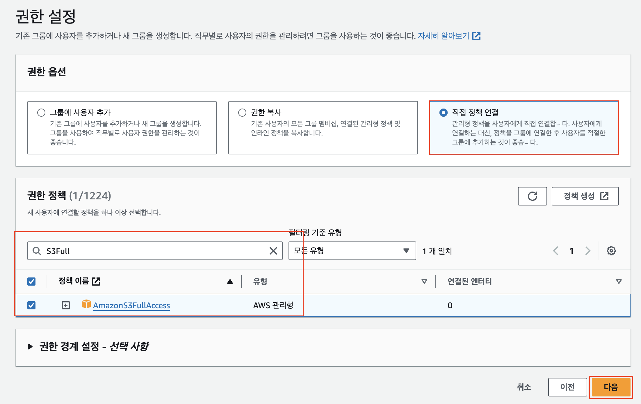 - 권한 옵션에서 ‘직접 정책 연결’은 AWS가 사용자들이 많이 사용하는 권한들을 미리 정의해 놓은 것이다.