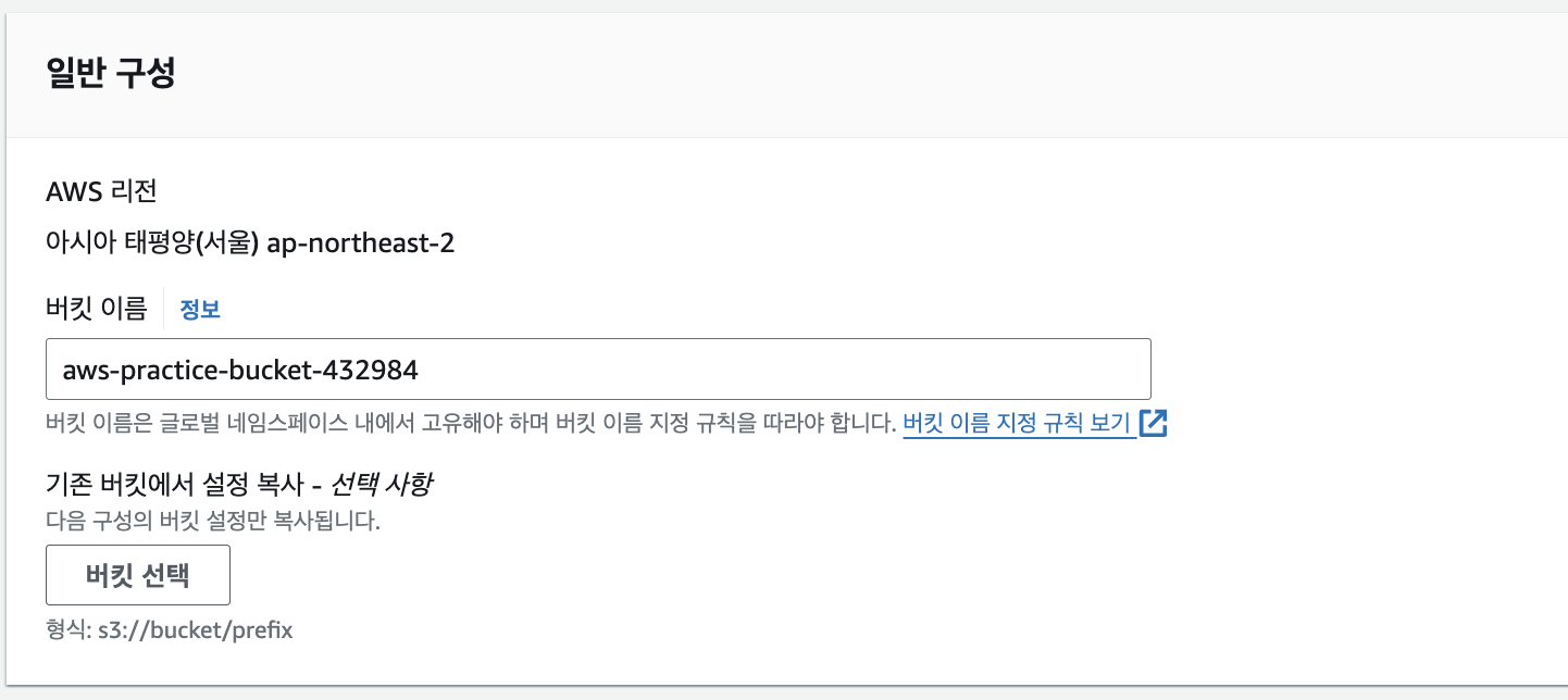 이름 같은 경우에는 중복이 없어야 하기 때문에 나만의 고유한 bucket 이름을 지정해야 한다.