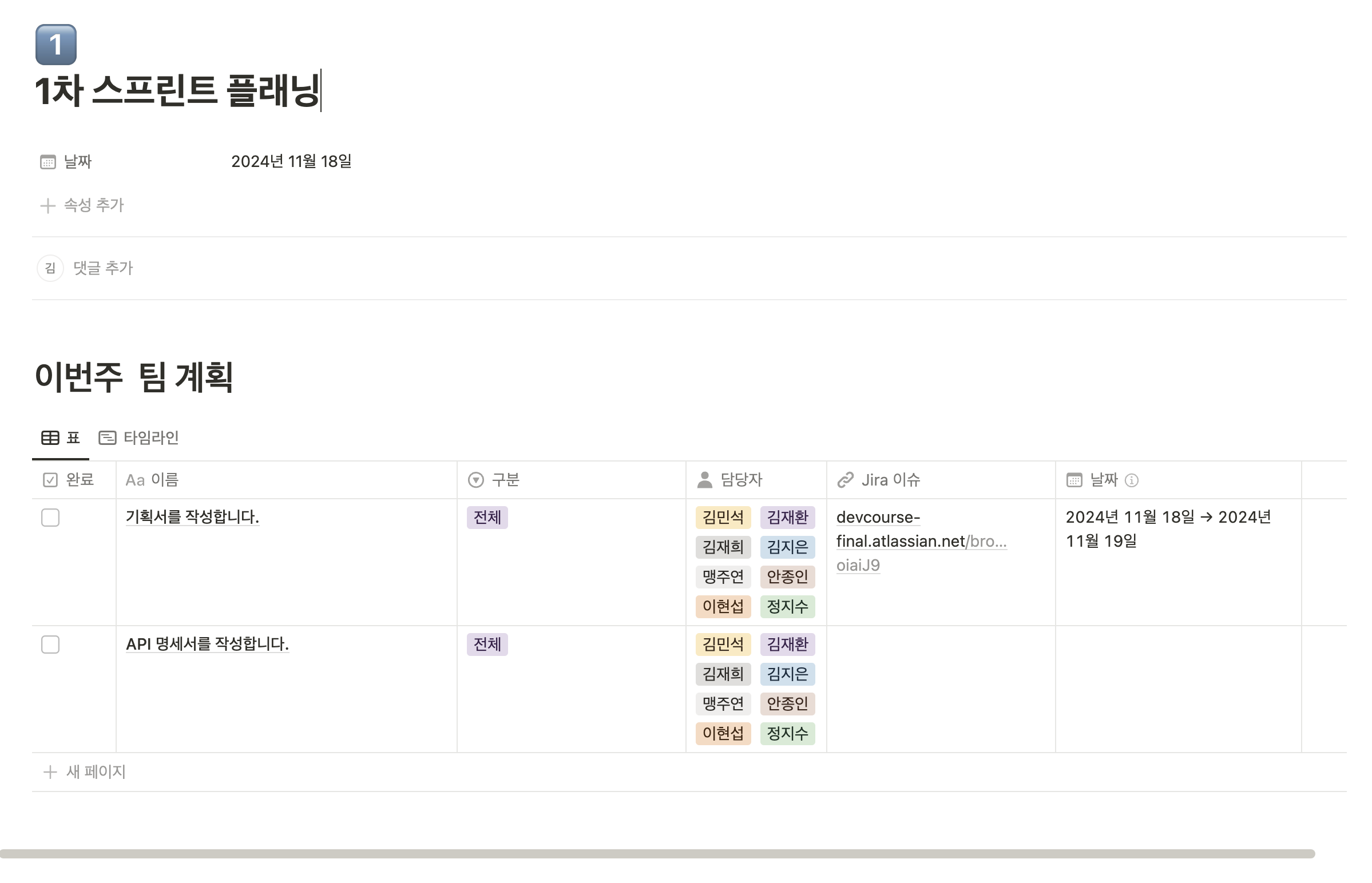 Jira를 사용하는 경우 문서작업은 보통 Confluence를 많이 사용하지만, 프로그래머스에서 Notion에 문서화를 진행하라는 요구사항이 있었기 때문에 Notion을 사용하였다.