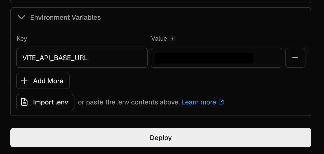 마지막으로 환경변수(서버 URL) 추가까지 한 뒤 Deploy 버튼을 누르면 된다.