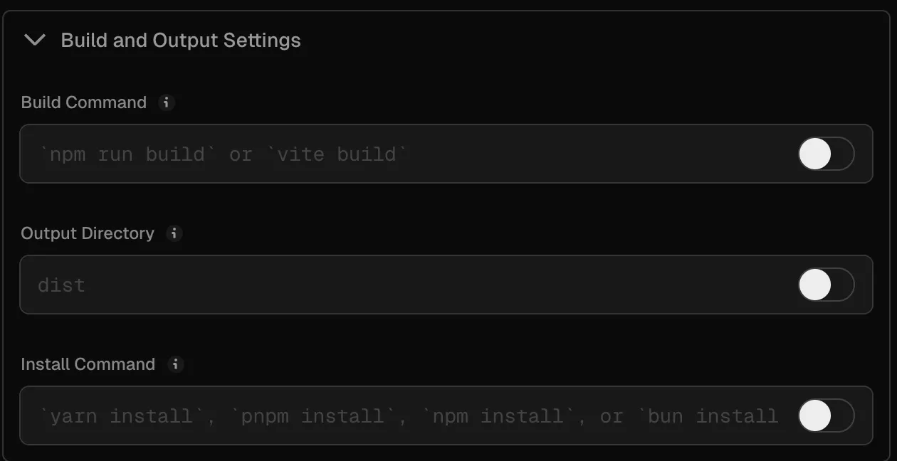 Build and and Output Settings은 Vite의 기본설정대로 하였다.