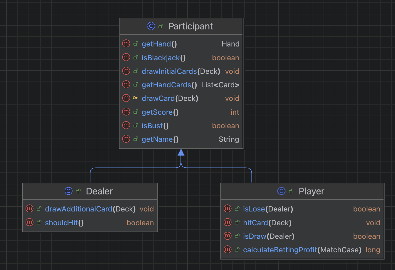 Participant에 공통 로직(초기 카드 뽑기, 블랙잭 여부 판단하기 등등)을 넣고 각각의 관심사는 하위 클래스에 추가한다.