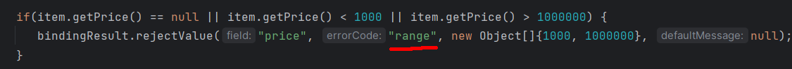 bindingResult.rejectValue("price", "range", new Object[]{1000, 1000000}, null);